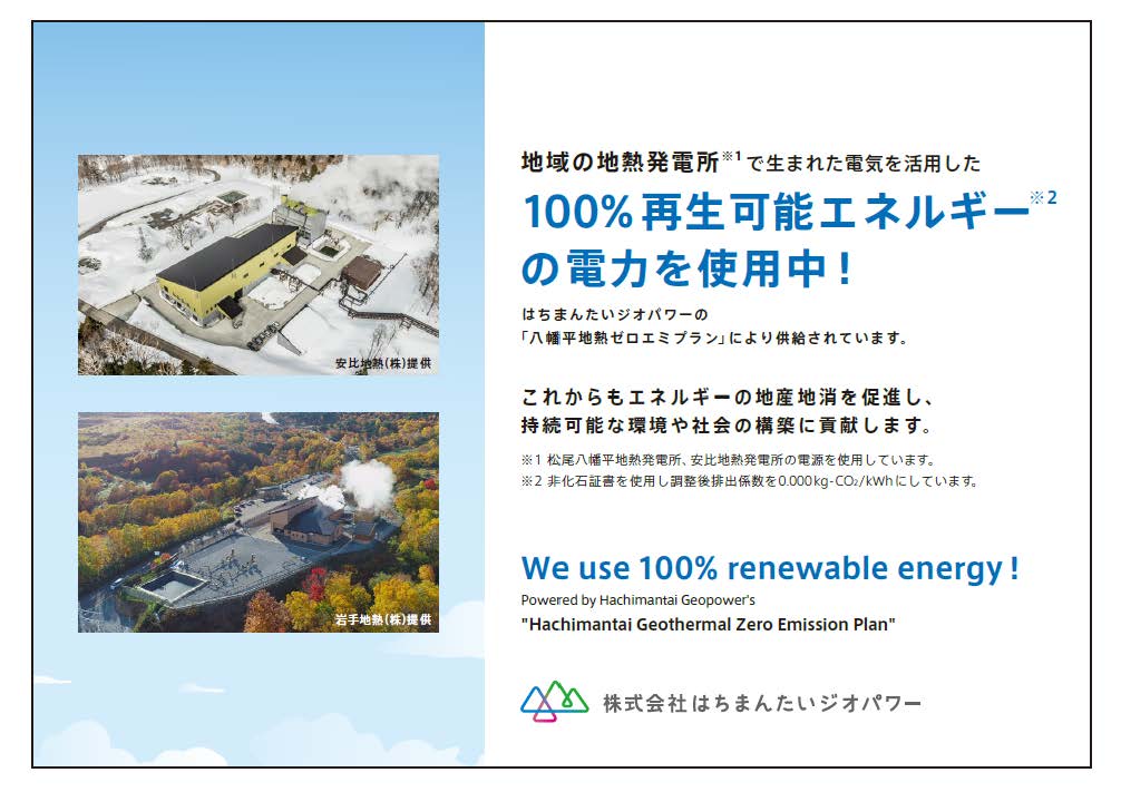 当社では、2025年8月1日 株式会社はちまんたいジオパワーと電力供給の契約しました。地元 八幡平市にある地熱発電所(松尾八幡平地熱発電所、安比地熱発電所)の電源を100%使用した再生可能エネルギーを工場電力として利用し、CO2排出量の削減に取組んでいます。
